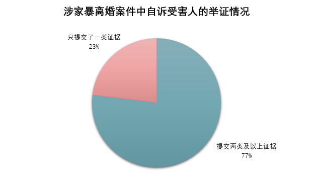而在23%的案件中,自诉受害人只就对方有家庭暴力行为向法院提交了一类证据。