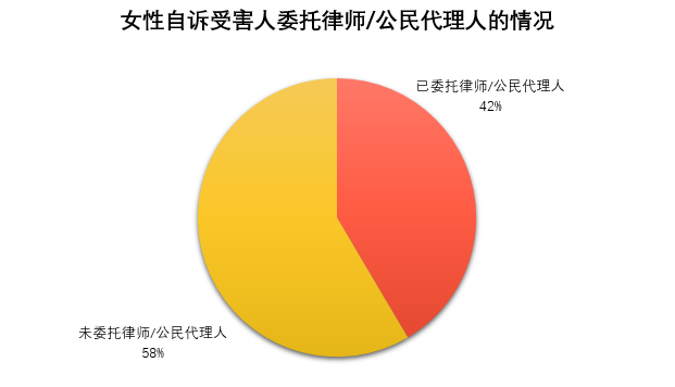 在701件自诉受害人为女性的涉家暴离婚案件中,女性自诉受害人委托律师/公民代理人的比例为42%。