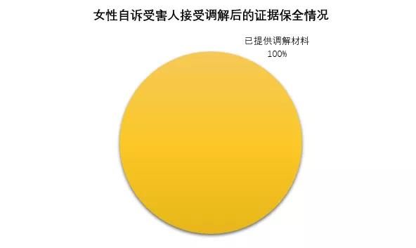 女性自诉受害人曾因遭受家庭暴力而寻求第三方调解的案件中,女性自诉受害人向法院提交调解材料的案件比例高达100%。