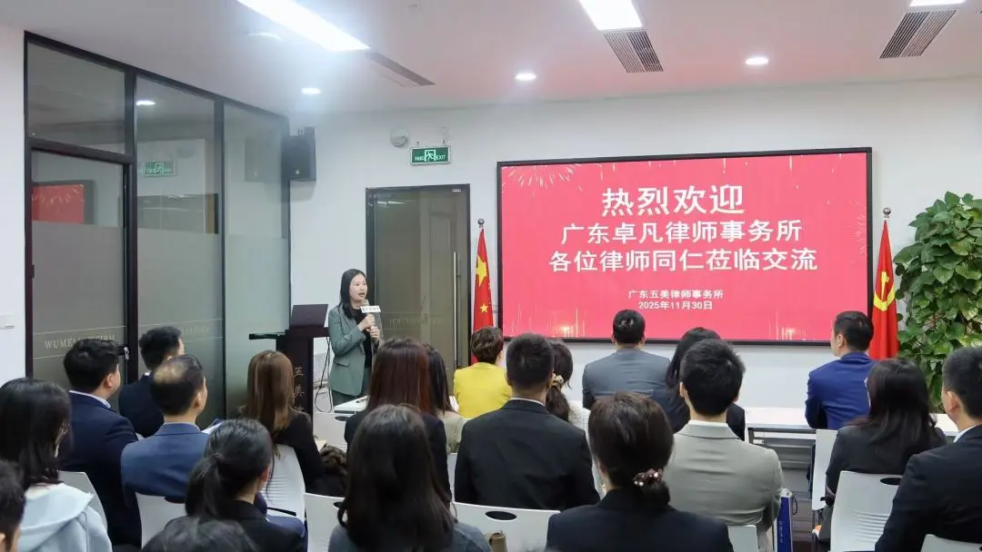 2025年11月30日,广东五美律师事务所热情迎接来自广东卓凡律师事务所青年律师成长训练营的青年律师们。本次参访交流活动由卓凡所党总支副书记、执行委主任林建源律师与党总支青年委员、执行委委员舒张律师共同带队。此次活动旨在搭建行业互动平台,助力青年律师提升专业能力,共同促进青年律师的专业成长与进步。