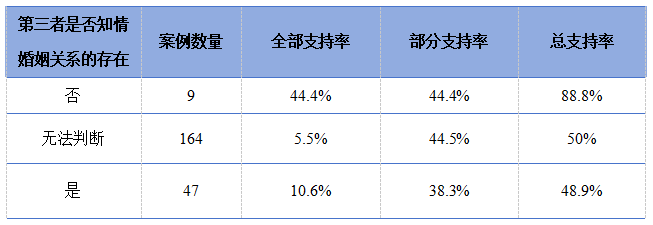 第三者对出轨方已婚事实是否知情,会直接影响抗辩的支持率——不知情的案例中,44.4%被完全支持、44.4%被部分支持,总支持率达88.8%;而知情的案例中,仅10.6%被完全支持、38.3%被部分支持,超半数被驳回。