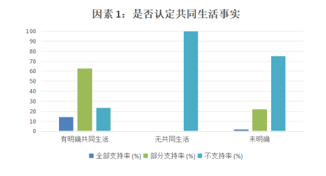 有明确共同生活事实的案例中,14.2%被完全支持、62.5%被部分支持,抗辩整体支持率达76.7%;而无共同生活事实的案例,抗辩100%被驳回;未明确共同生活事实的案例中,75.2%被驳回,仅21.9%被部分支持。这一数据清晰表明,明确的共同生活事实是共同生活抗辩成立的基础。