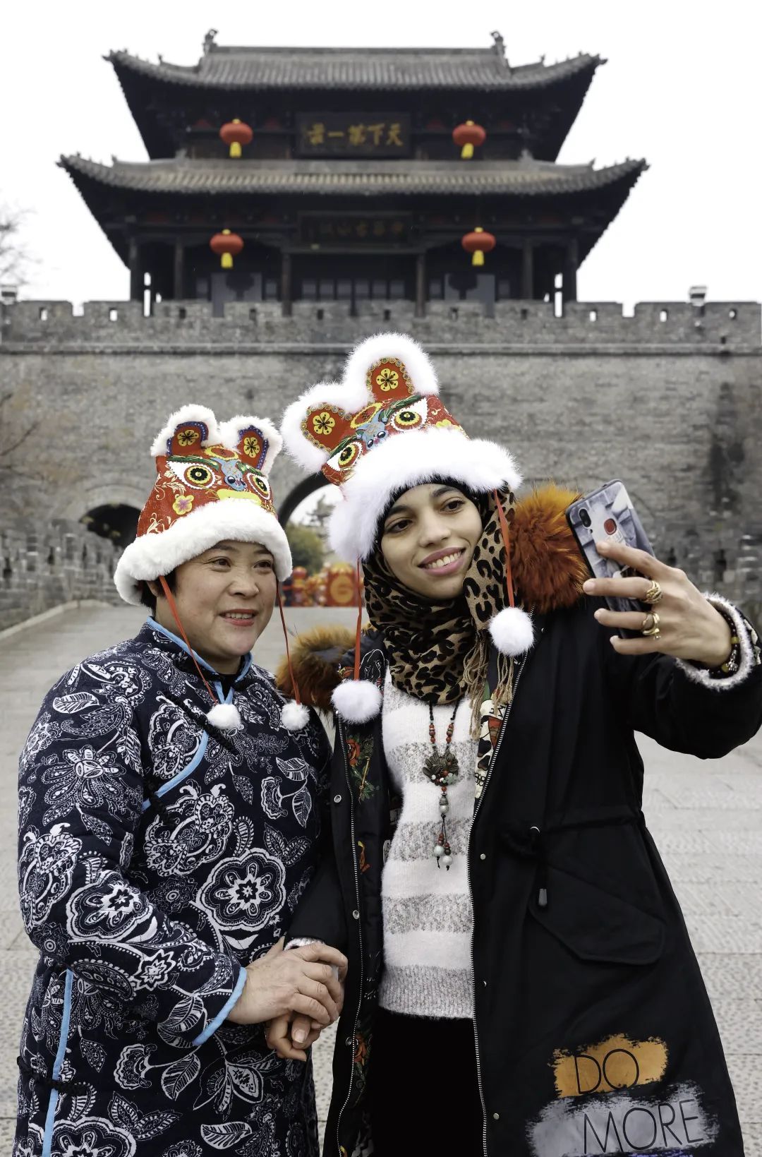 2022年1月22日,来自埃及的“洋媳妇”艾米娜在山东省枣庄市台儿庄古城戴虎头帽游玩,感受中国传统文化魅力,喜迎农历虎年的到来。艾米娜已嫁到台儿庄10多年,喜爱中国的传统文化。中新社发 吉喆摄