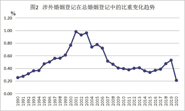涉外婚姻登记在总婚姻登记中的比重变化趋势  数据来源:《中国民政统计年鉴》