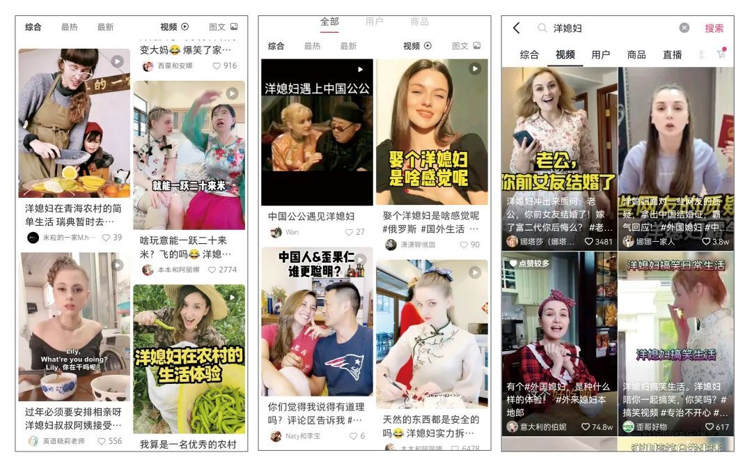 像艾瑞卡这样的洋媳妇似乎越来越多。打开抖音、小红书、今日头条等社交软件,不少洋媳妇在上面发布视频分享她们的生活故事,有的在卖货,有的当模特,有的做博主等。